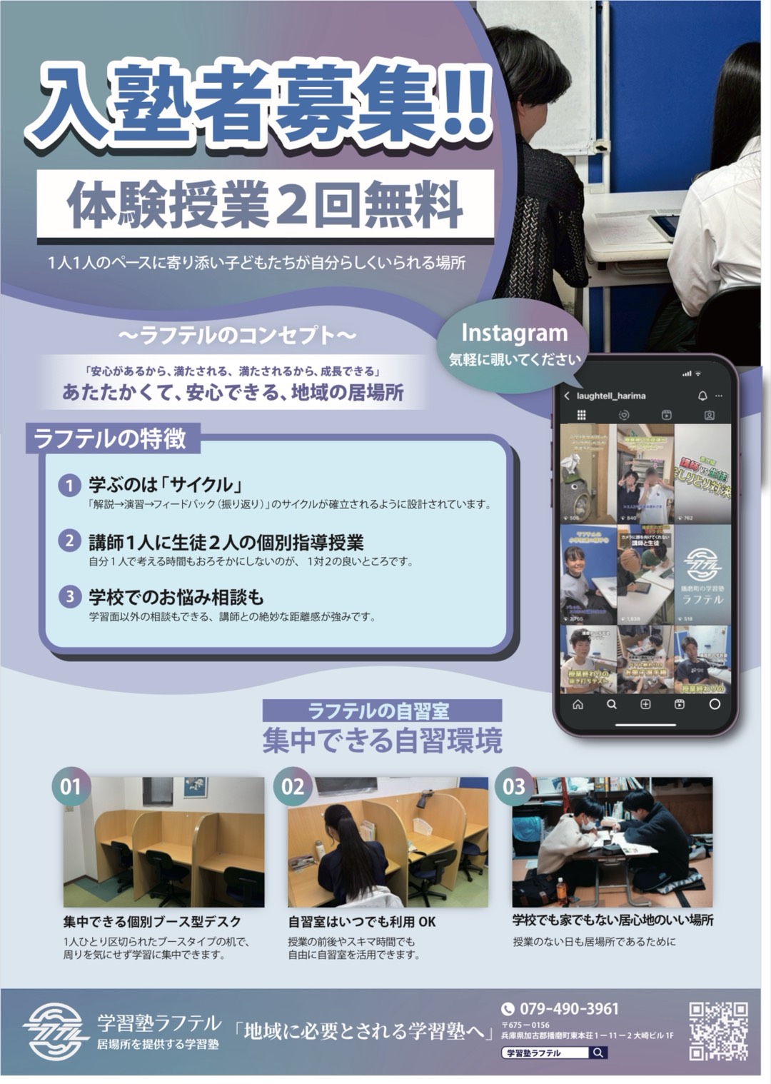 学習塾ラフテルの新しい「体験授業」のチラシが完成いたしましたので、お知らせいたします。今回のチラシでは、当塾ならではの雰囲気を伝達することに重きを置いたデザインに仕上げました。こちらのチラシは、折を見て、新聞折り込みにて順次配布していく予定です。チラシをご覧いただき、少しでもご興味をお持ちいただけましたら、ぜひお気軽に無料体験授業へお申し込みください。スタッフ一同、皆様からのお問い合わせを心よりお待ちしております。